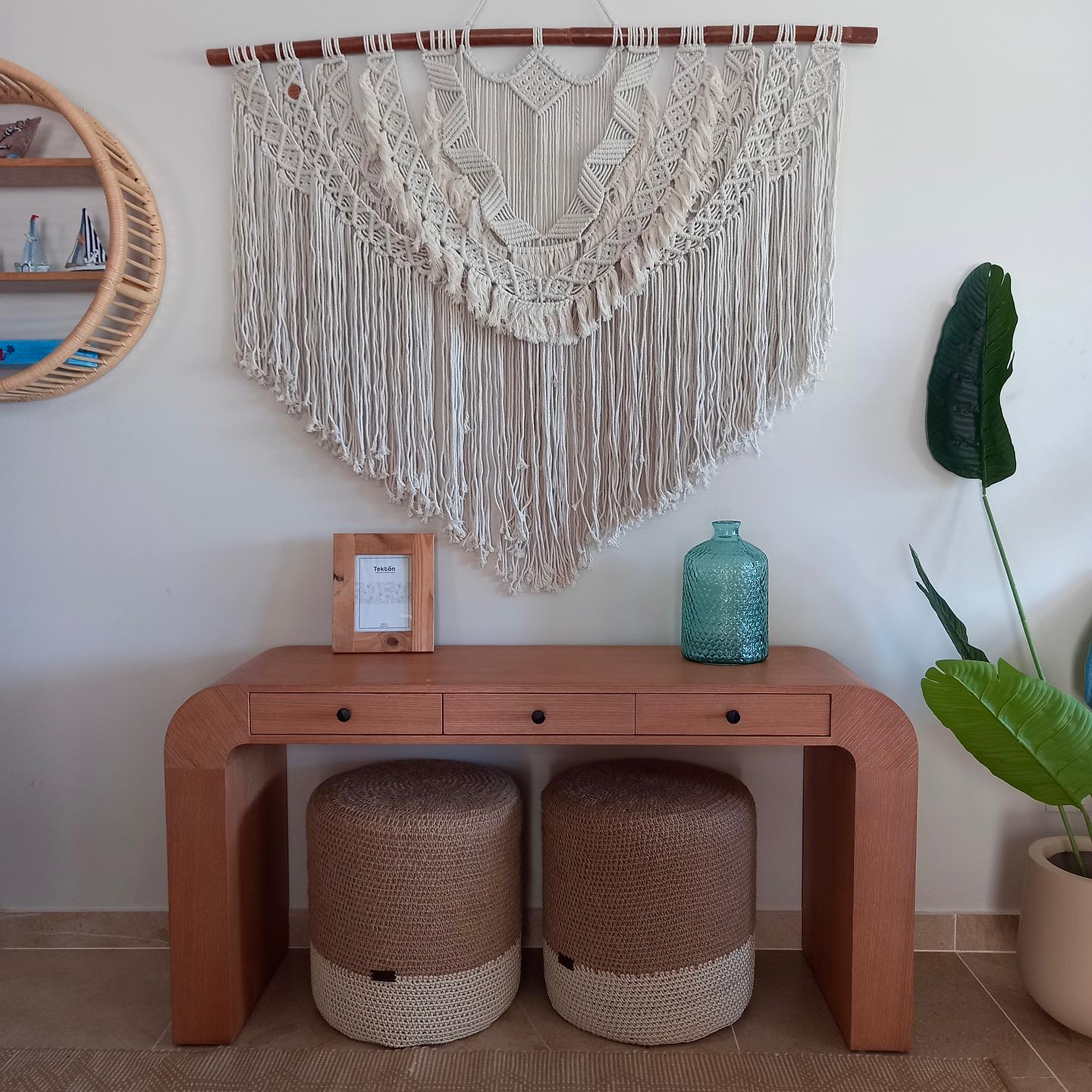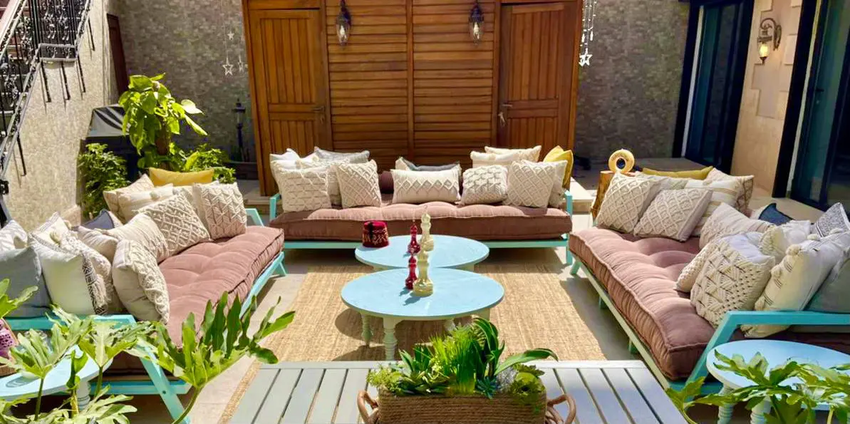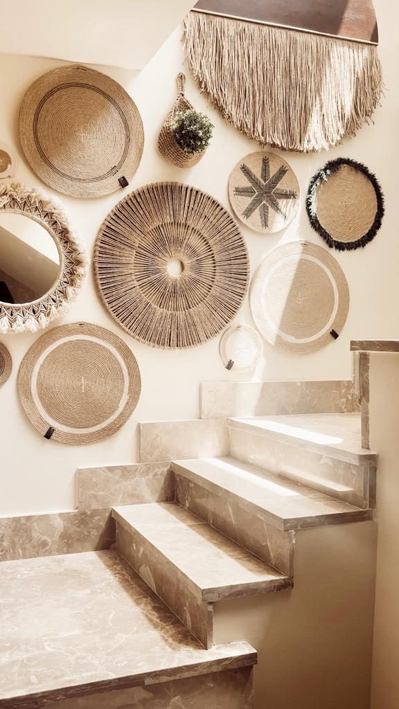 The collaboration included shading devices (pergolas), cushions, handwoven rugs, signature lighting units, crafted ottomans, decorative mirrors, tables, pantry, sofas, chairs, baskets, screens, wall plates, and wall hangs designed with Sadu’s signature rope and weaving techniques.